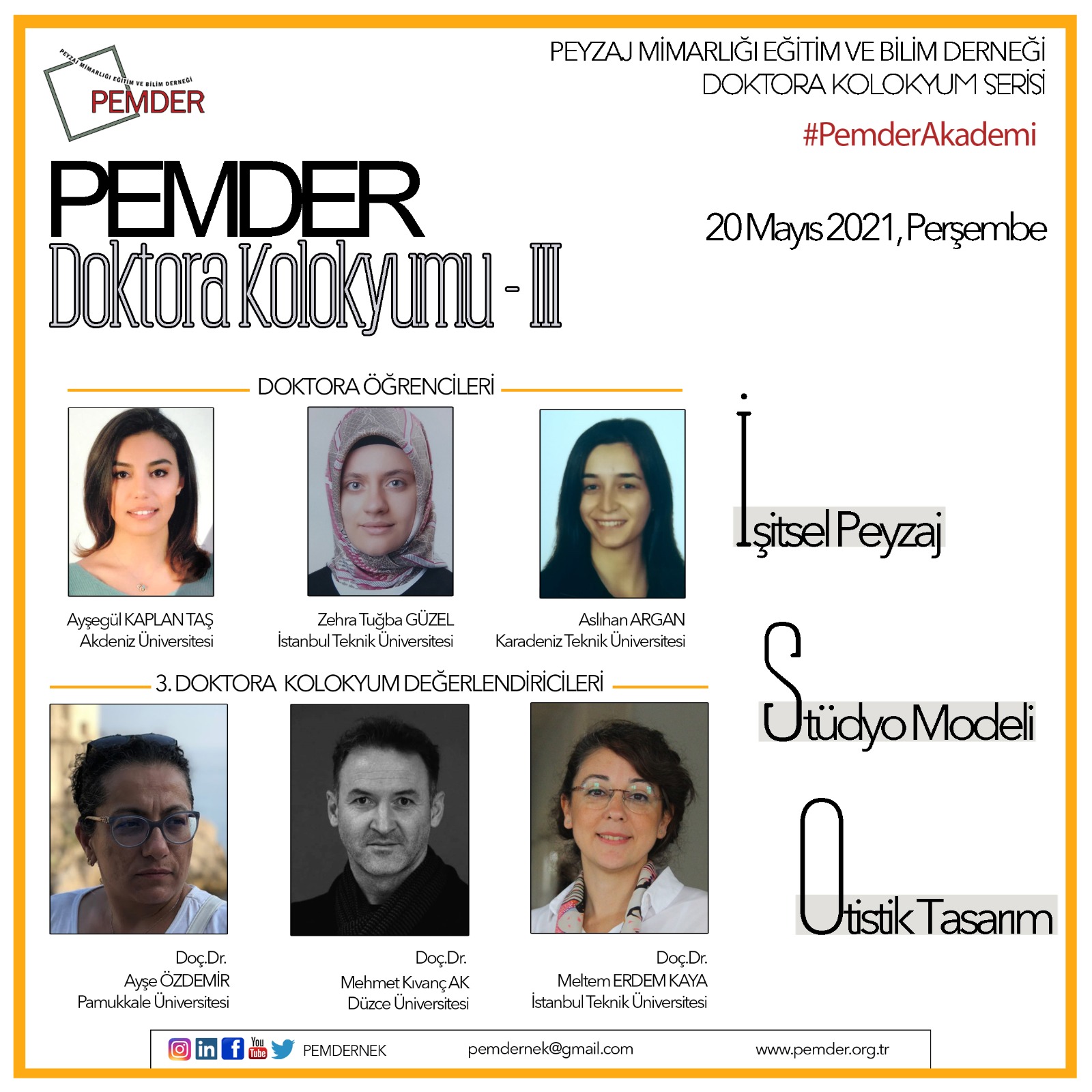 Ülkemizde Peyzaj Mimarlığı araştırmalarının niteliğini artırmayı amaçlayan ve ilki 18 Mart 2021, ikincisi 22 Nisan 2021 tarihinde gerçekleştirilen PEMDER Doktora…
