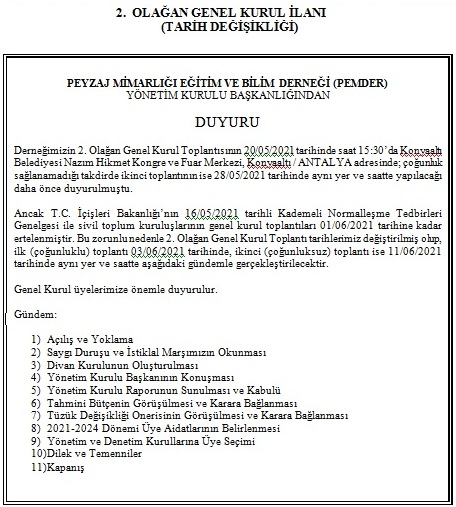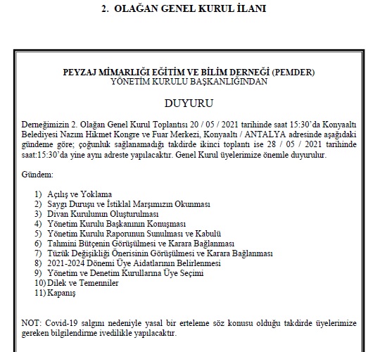 Değerli üyelerimiz, Derneğimizin 2. Olağan Genel Kurul Toplantısı 20 Mayıs 2021 tarihinde saat 15:30’da Konyaaltı Belediyesi Nazım Hikmet Kongre ve…